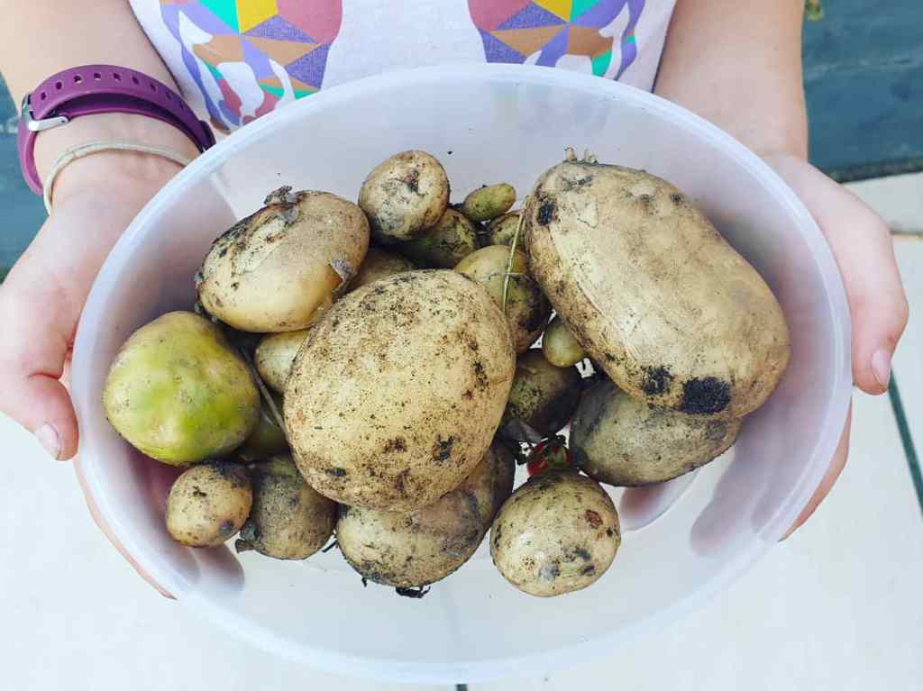 Potatoes are SO easy to grow! Take a potato that has started to sprout, plant it in some soil. We have a veg patch, but it can be done in a barrel, a bucket….even a wellington boot! You need to make sure they are quite low down in the soil, as you need to add more soil every now and then to help them along. They need plenty of water. The plants grow pretty tall! The plants flower, and when the flowers/buds go/drop off, the potatoes are ready to harvest. You don’t have to get them straight away though, we picked some of our a week later or so later, and they were fine.